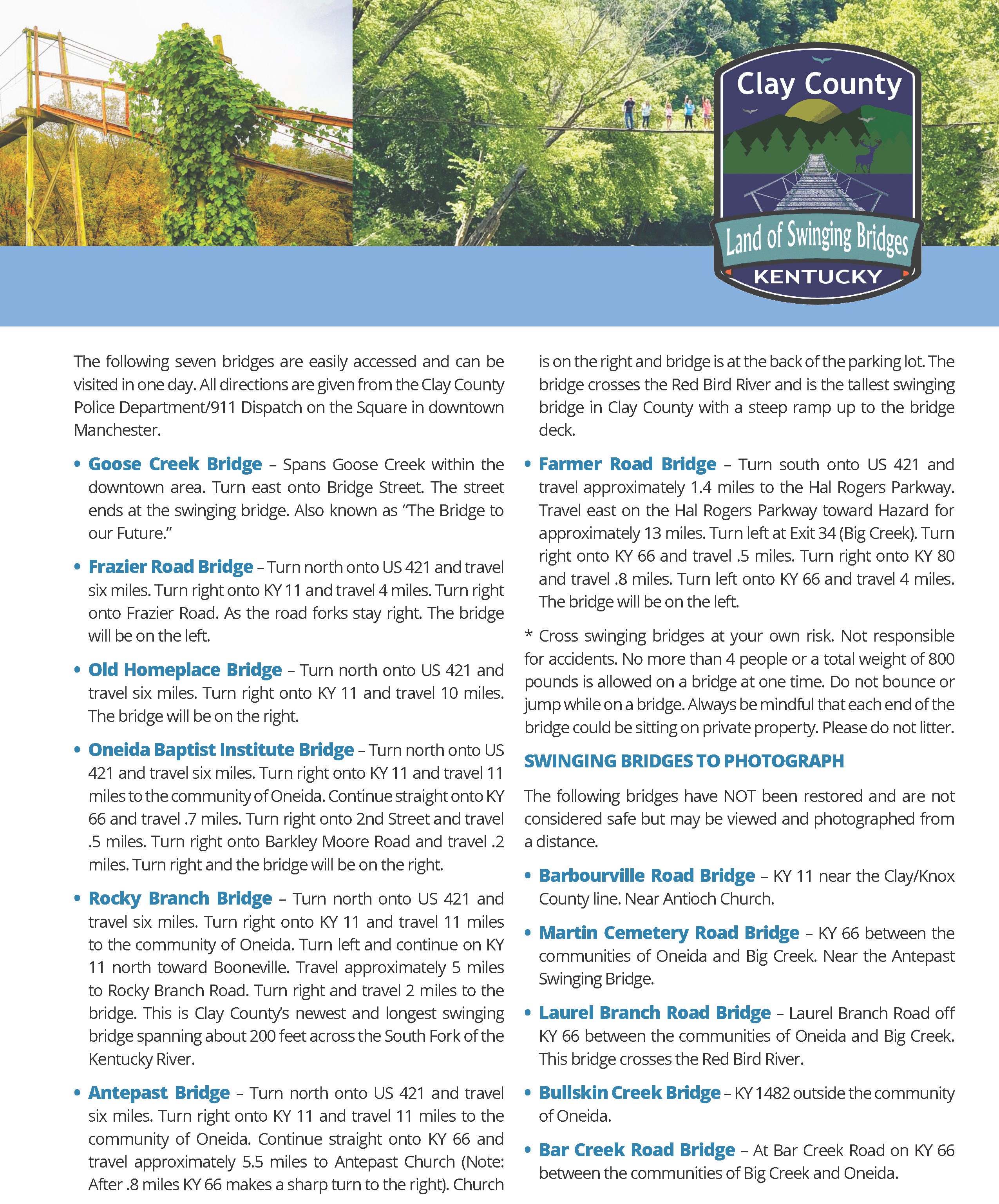 Many of these historic relics of Appalachian history still tower over Goose Creek, Red Bird, and the South Fork Rivers. Visit Clay County, the “Land of Swinging Bridges,” and discover the romance, history, and adventure of these cherished swinging bridges.